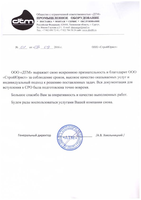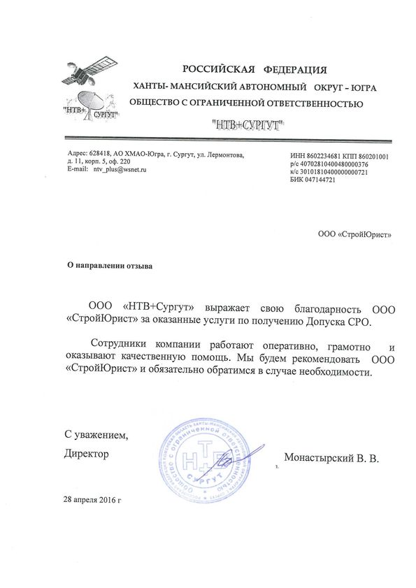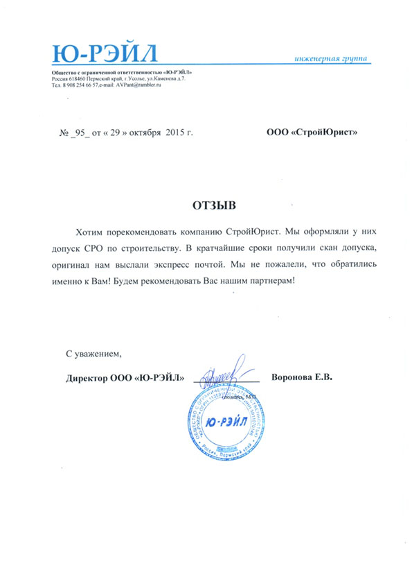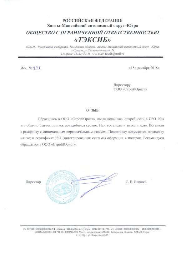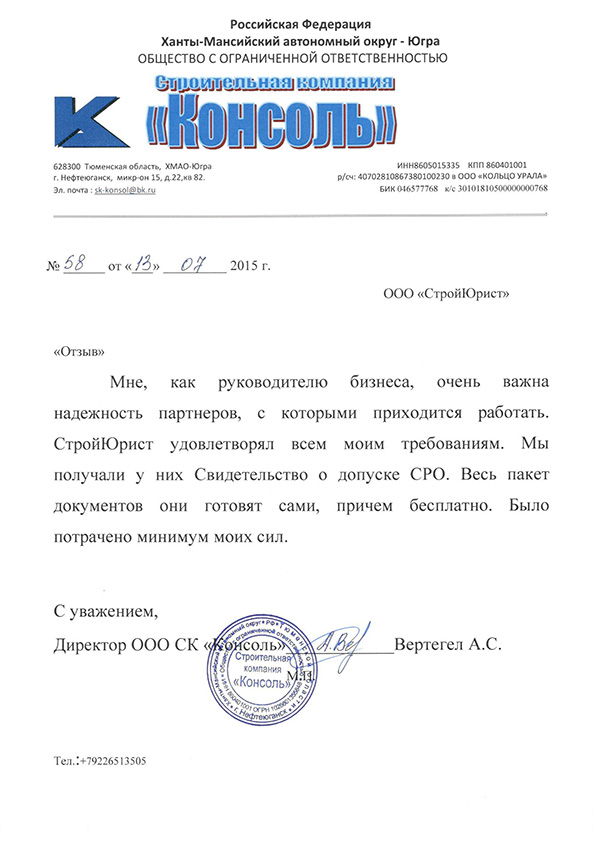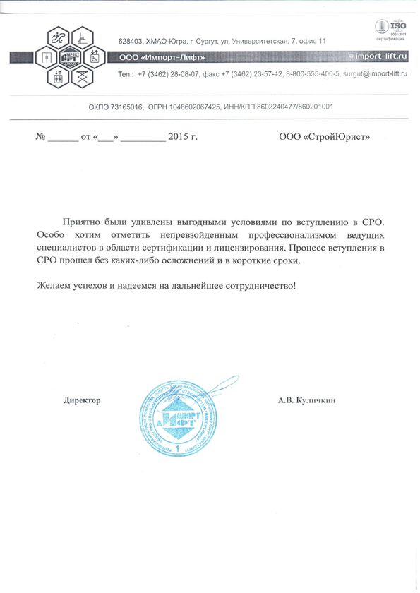 Отзывы клиентов "СтройЮрист" по вступлению в СРО в Салехарде