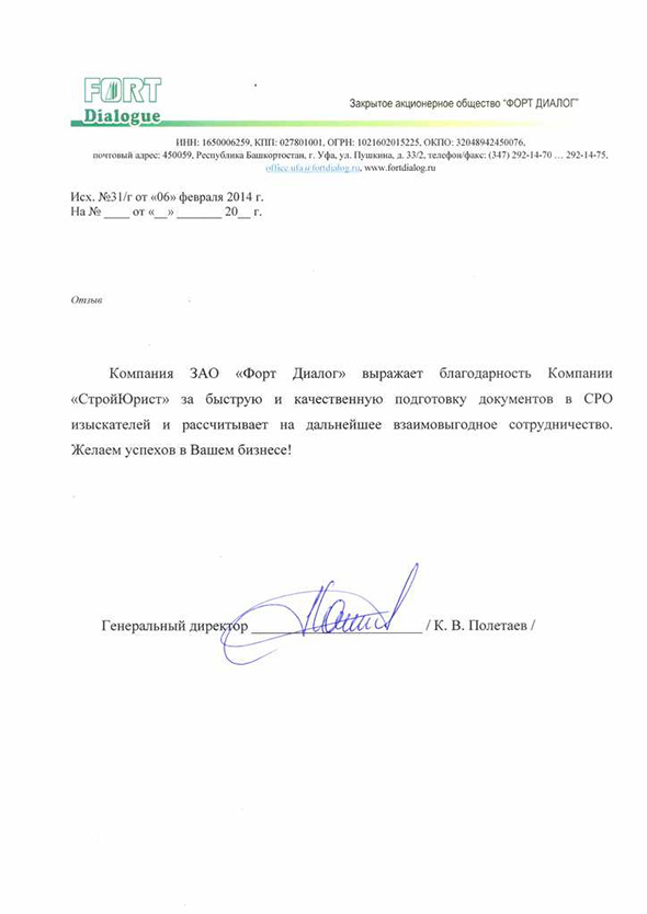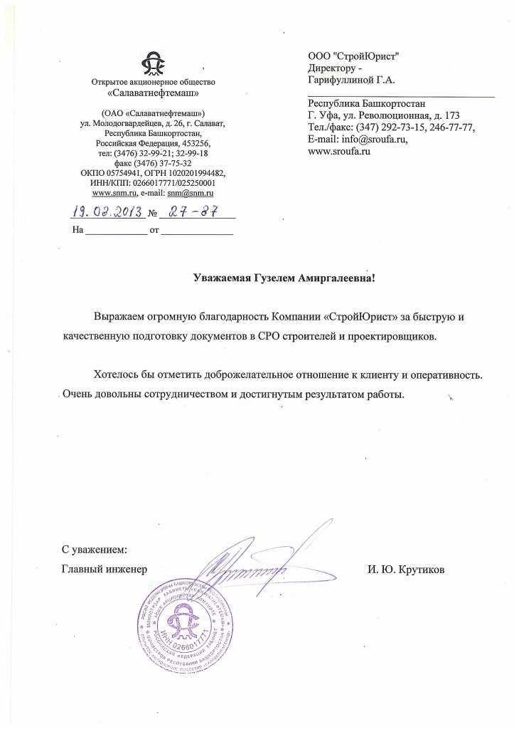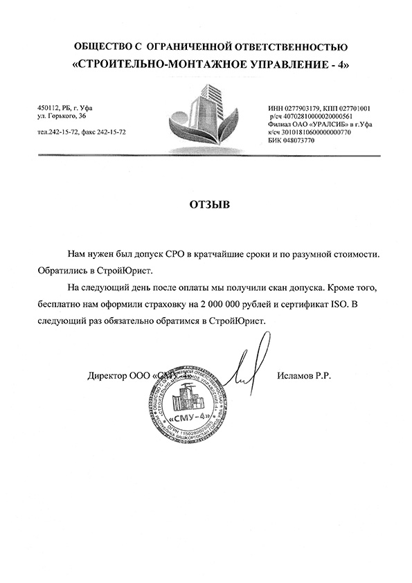 Отзывы клиентов "СтройЮрист" по вступлению в СРО в Салехарде